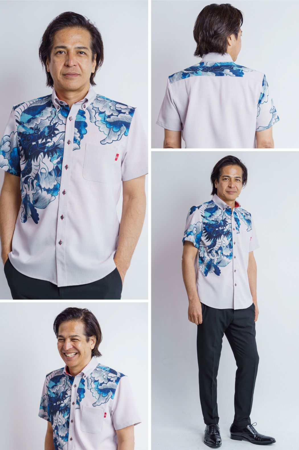 濃艶な牡丹の中で戯れる龍の図。あえてその表情を抑えることで 、龍のもつ神話性を演出しながらもワークウェアとして着こなしやすいデザインに仕上げました。ざっくりとしたタッチでシボ加工のある生地を使用しています。