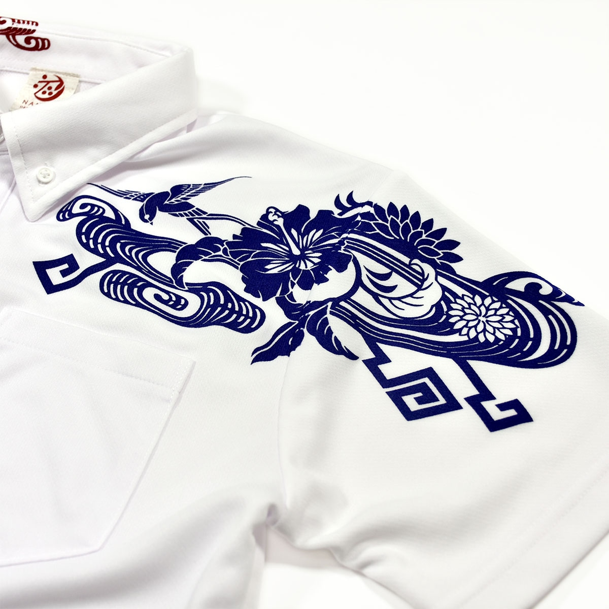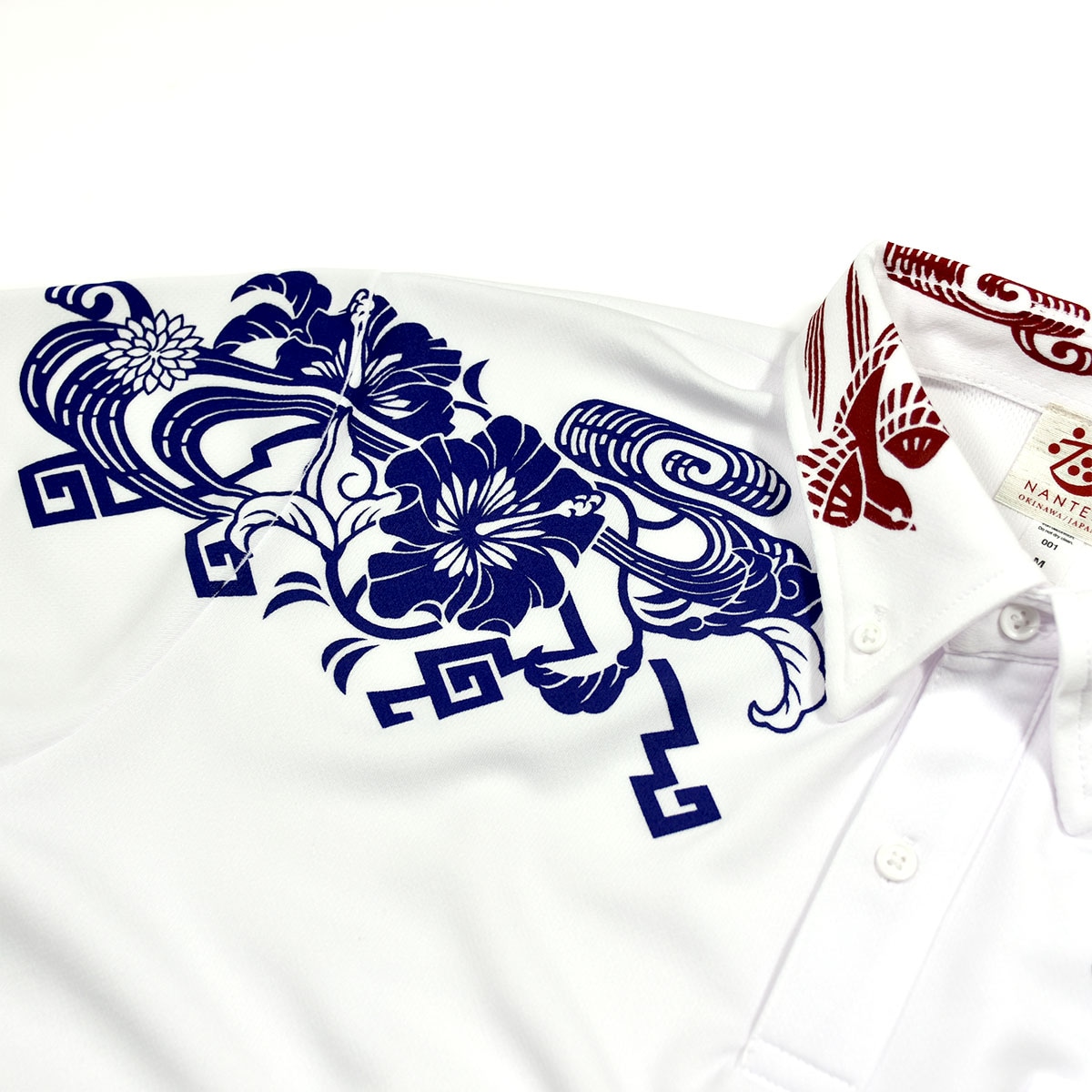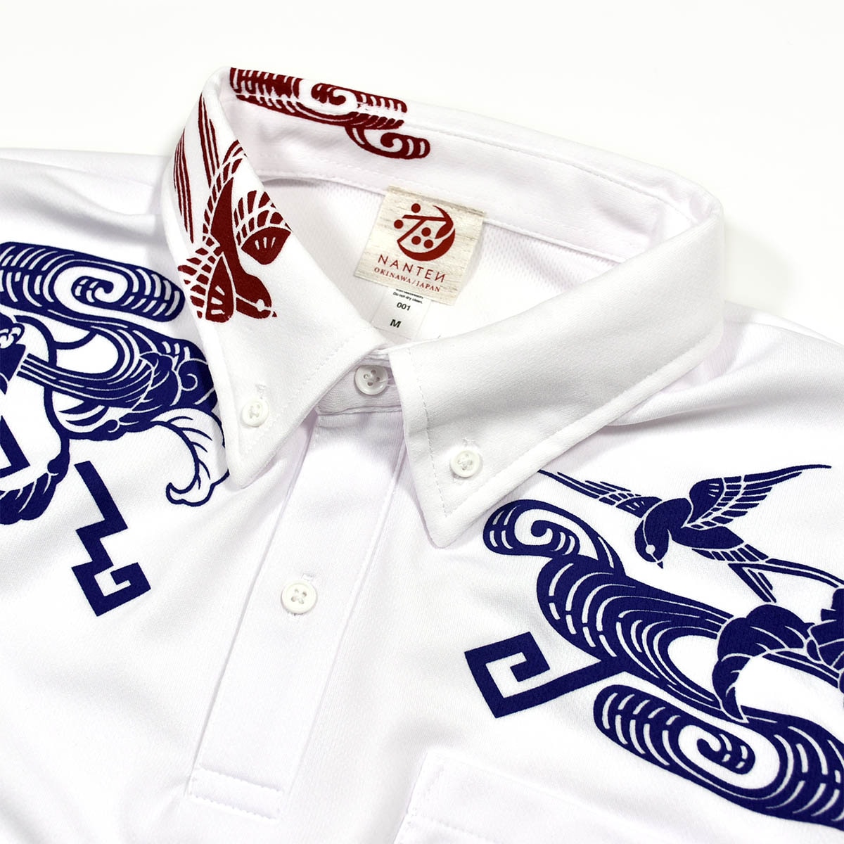 嵐をものともぜす力強く飛ぶ小鳥の姿を、紅型風にアレンジした南天らしいデザインです。