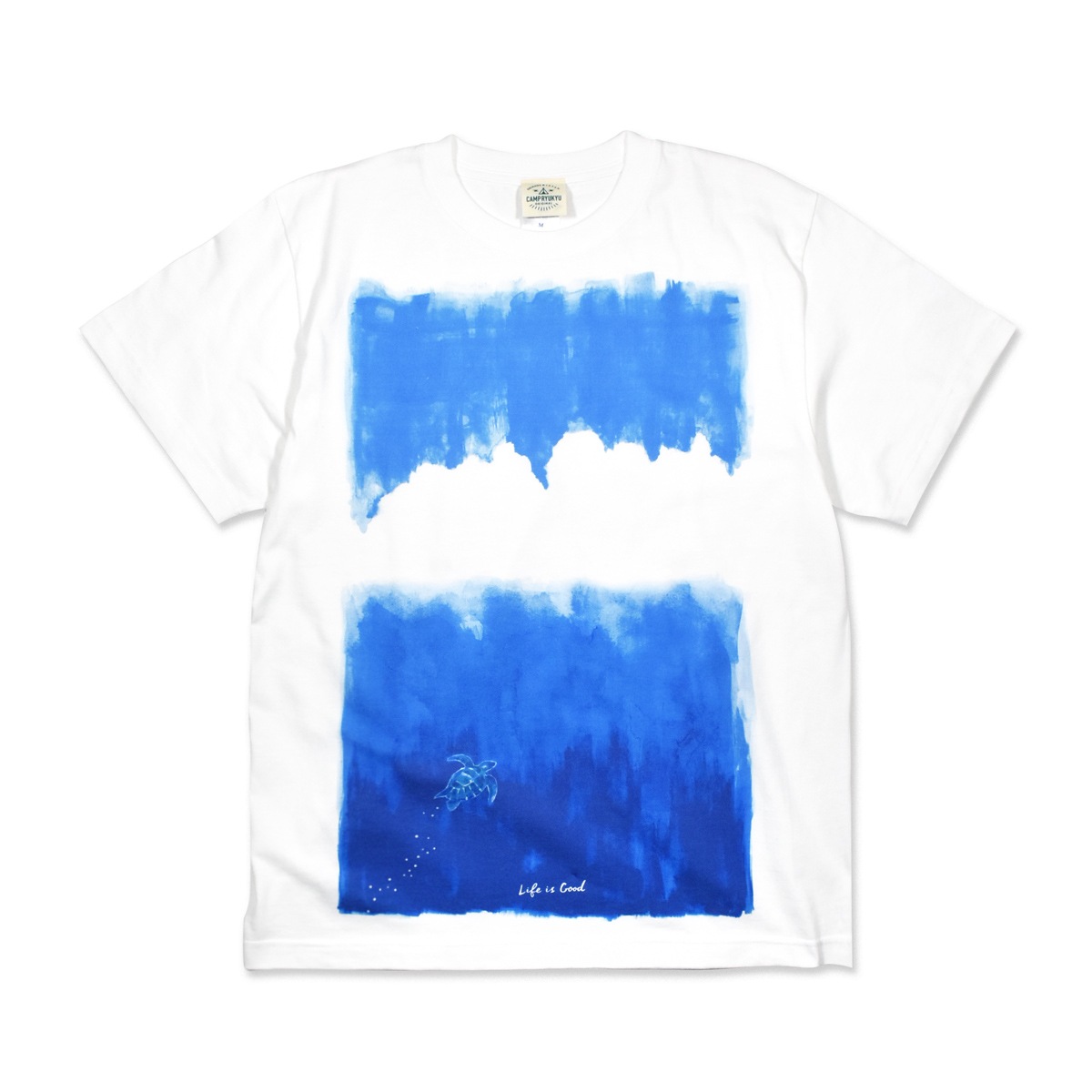沖縄の青い海、白い雲、青い空と優雅に泳ぐウミガメ!