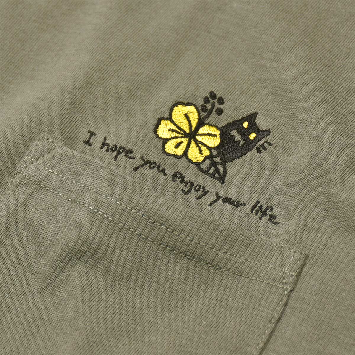 ハイビスカスとシーサーが刺繍で表現された、ラフなタッチが個性的なデザインです。シンプルで着やすいポケTEE は、重宝するアイテム間違いなし♪