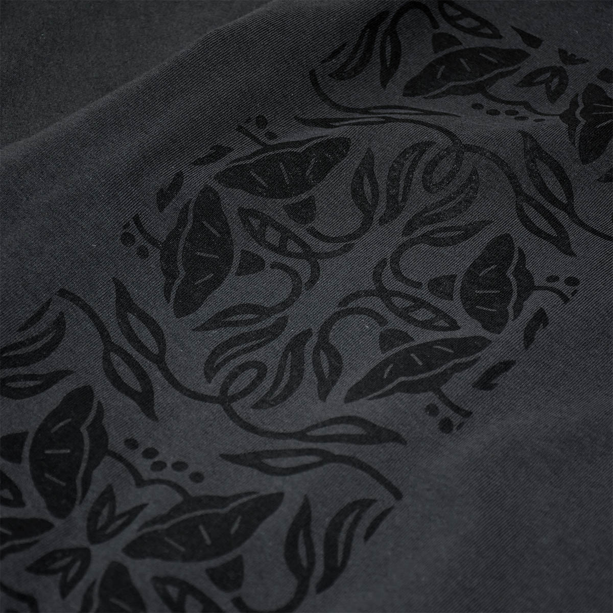 横から見たハイビスカスのシルエット、葉、つぼみをシンプルに図案化したデザイン。