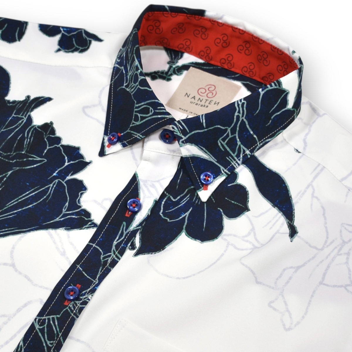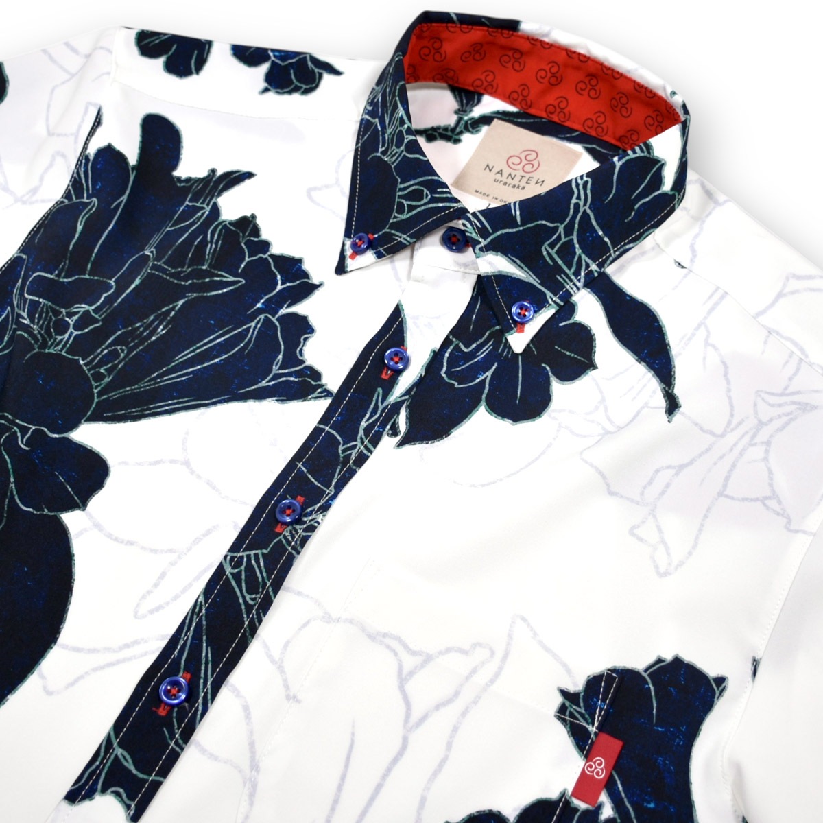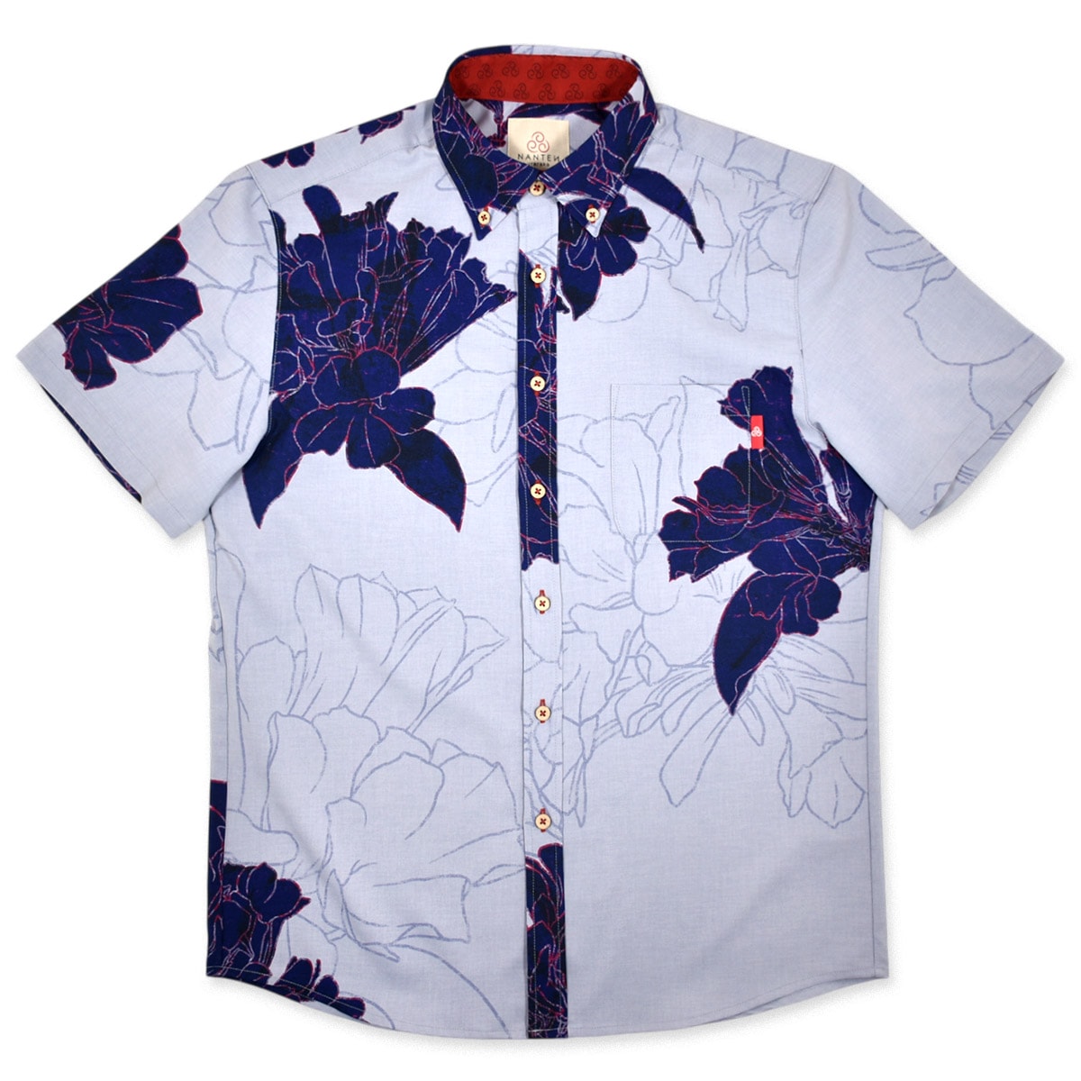 ハイビスカスなどの5つの花弁を持つ花をデフォルメした紋様柄を左胸に同色で刺繍。