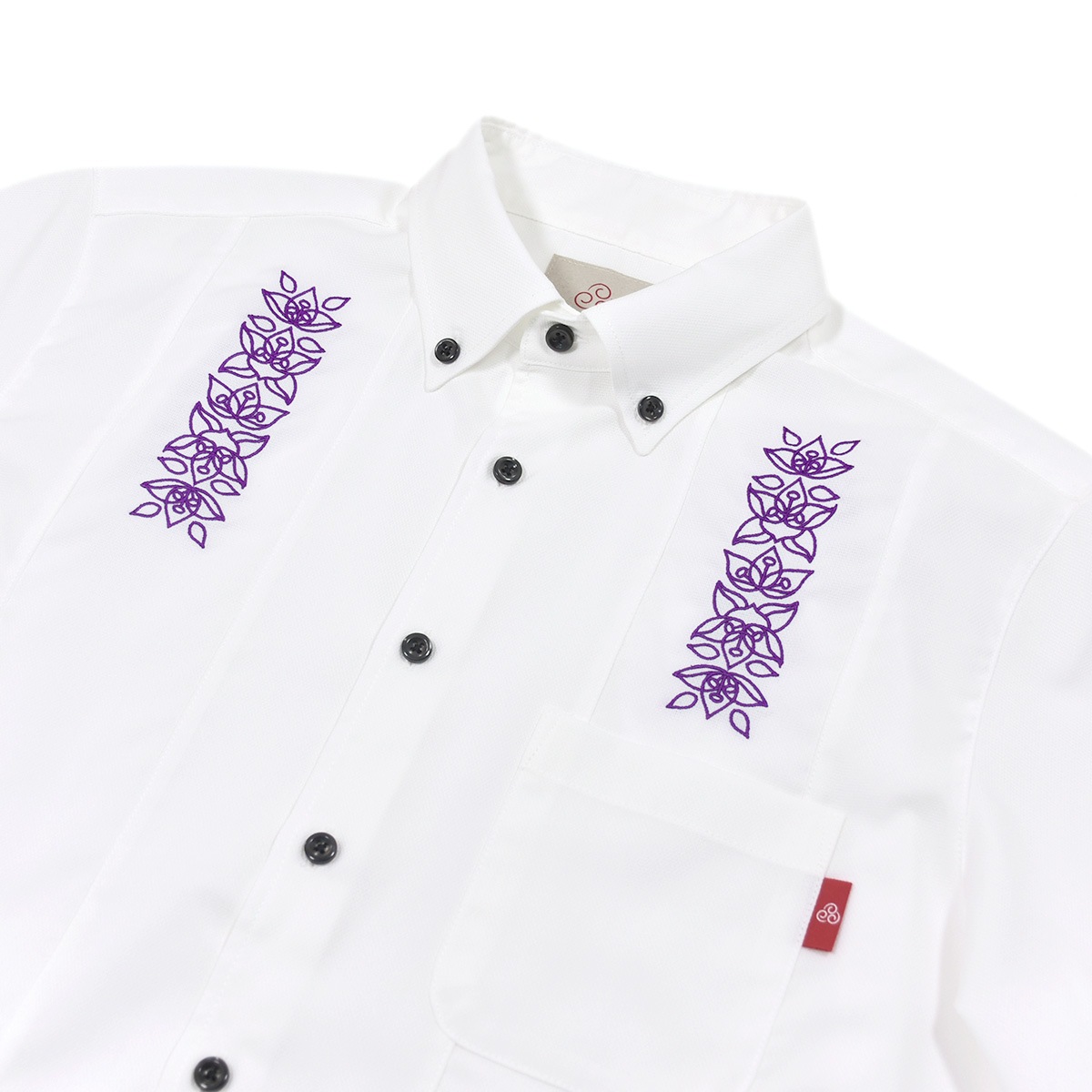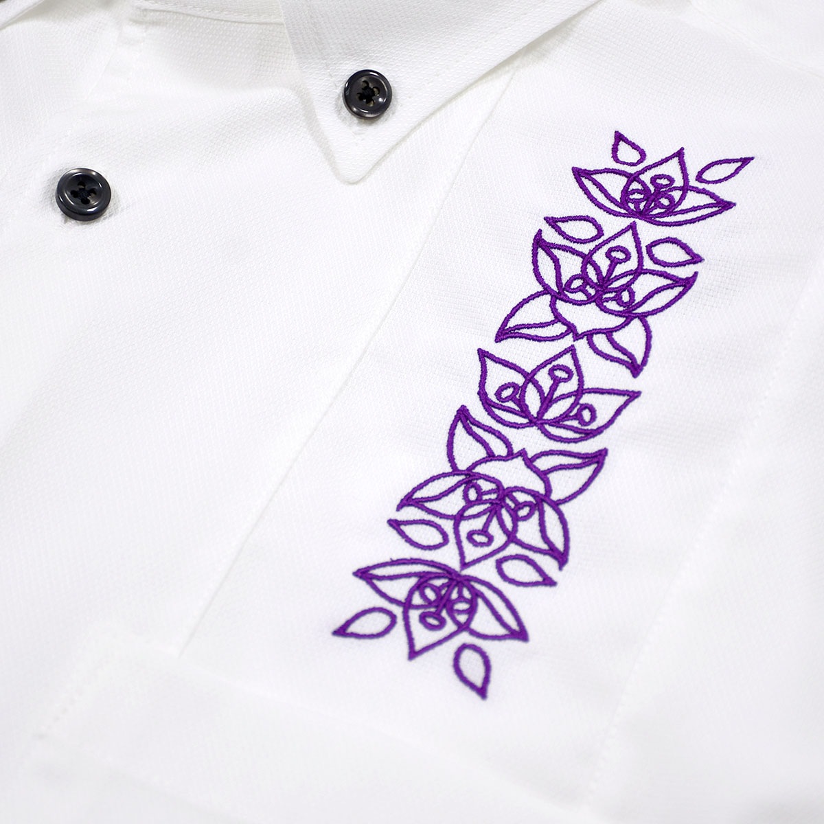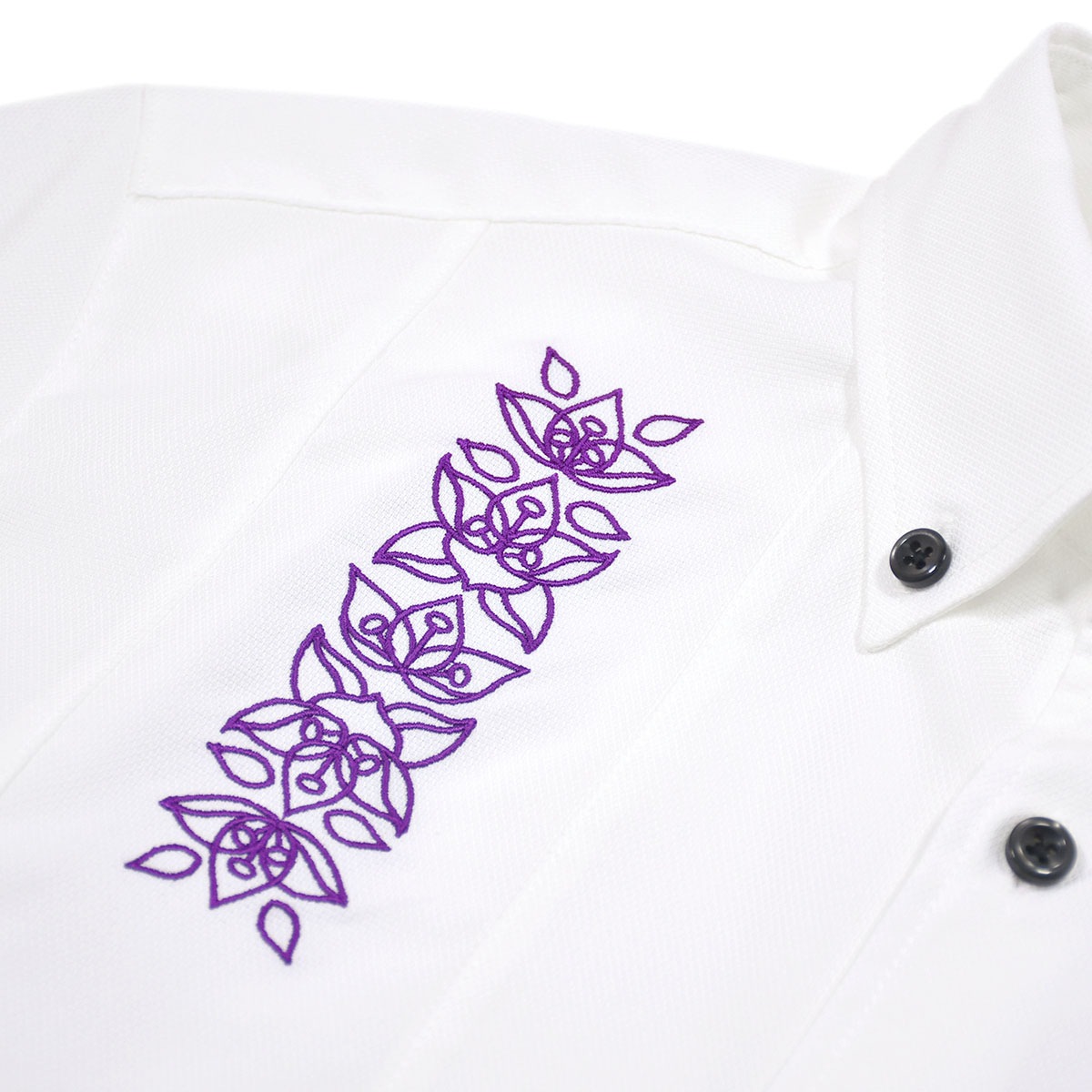 ハイビスカスなどの5つの花弁を持つ花をデフォルメした紋様柄を左胸に同色で刺繍。